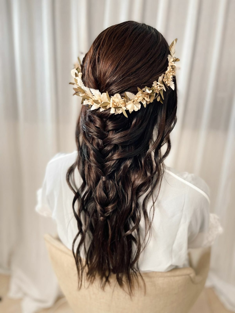 Este modelos lo realizamos con hojas de Samambaia blanca importada y mix de otras variedades seleccionadas especialmente para los tocados de la nueva temporada 2022. La combinación de colores la podés elegir.