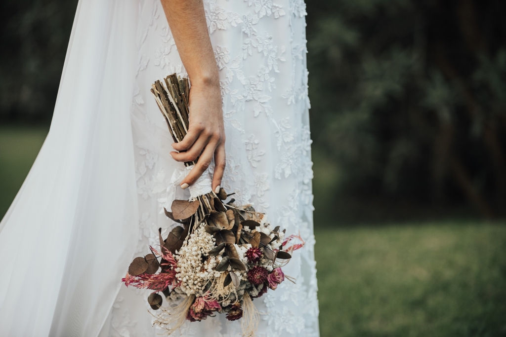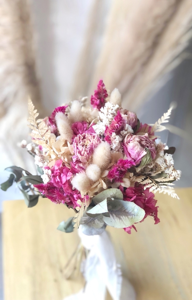 Ramo de Novia único con peonías secas tamaño mediano. Las medidas aproximadas son 25 cm de Diametro por 30 cm de Alto.
