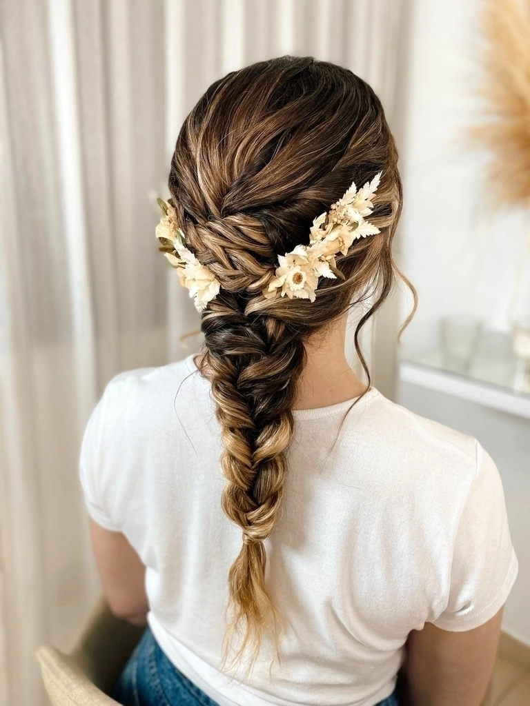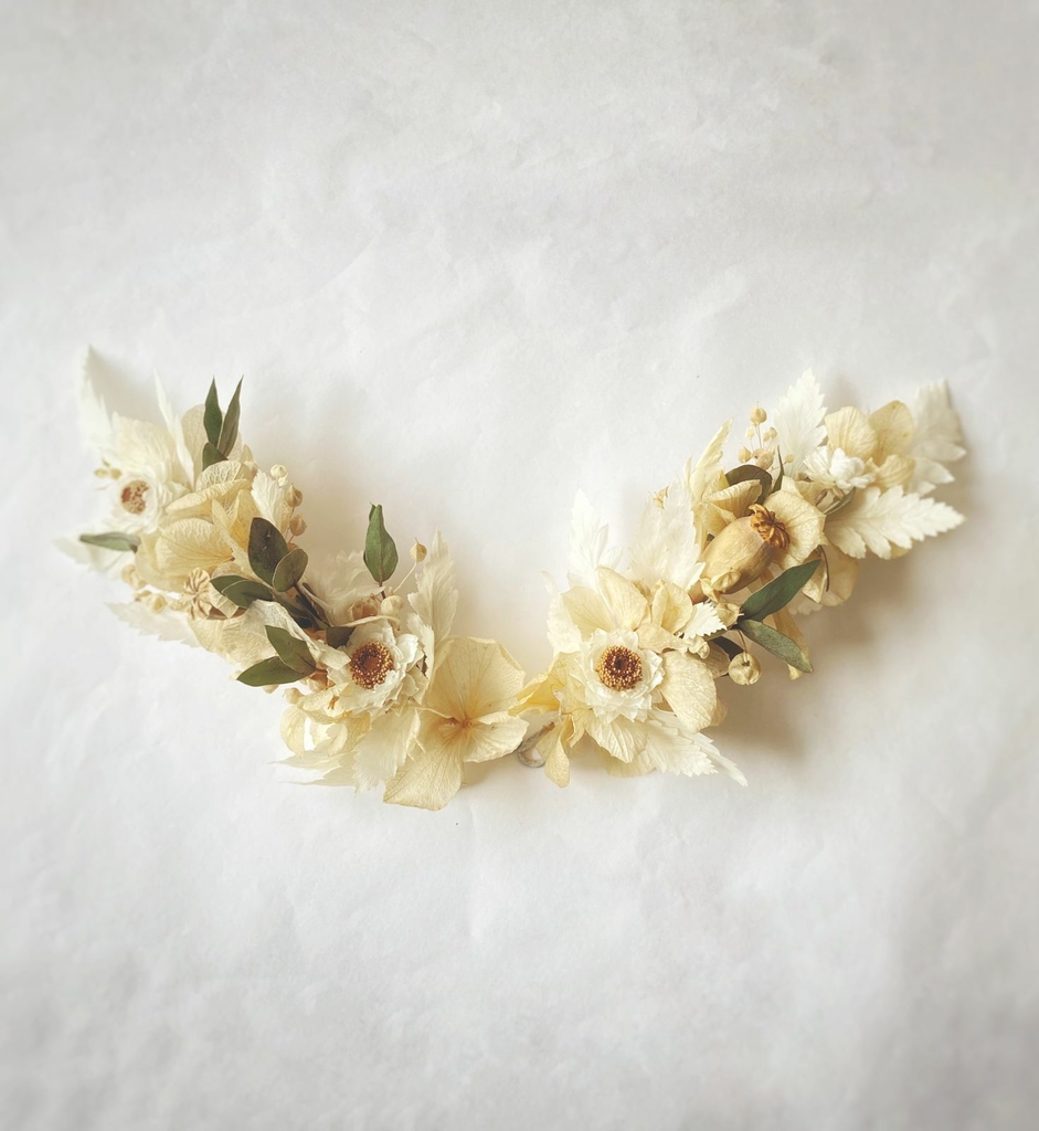 Este modelos lo realizamos con hojas de Samambaia blanca importada y mix de otras variedades seleccionadas especialmente para los tocados de la nueva temporada 2022. La combinación de colores la podés elegir.